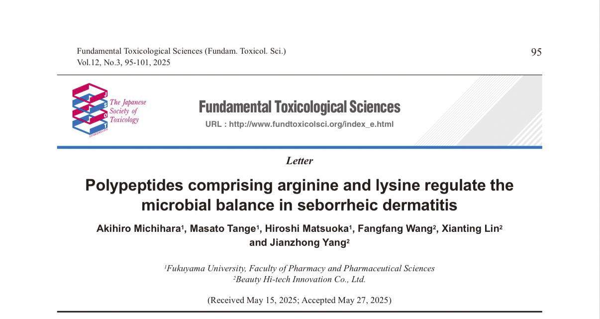 社長 楊建中、部長 林嫺婷、主任研究員 王放放は福山大学との共同研究で電子学術雑誌「Fundamental Toxicological Sciences」に アルギニンとリジンを含むポリペプチドの脂漏性皮膚炎における微生物のバランス調節 について論文が掲載されました。